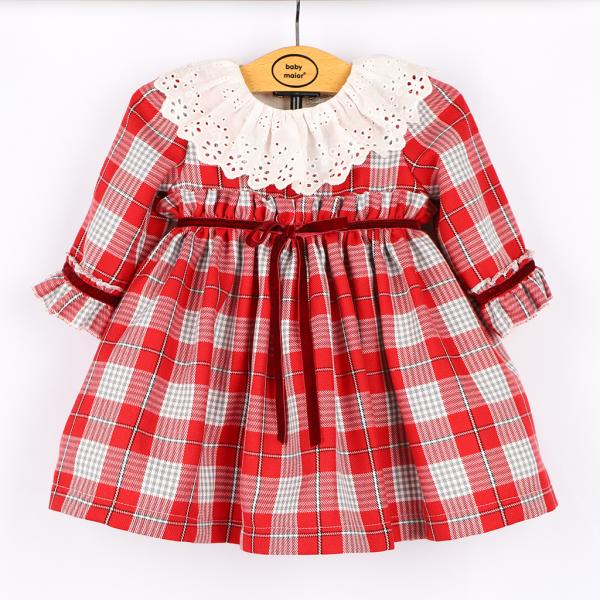 Vestido para Bebé Tecido em Xadrez com Folho na Gola e Fita de Veludo na Cintura